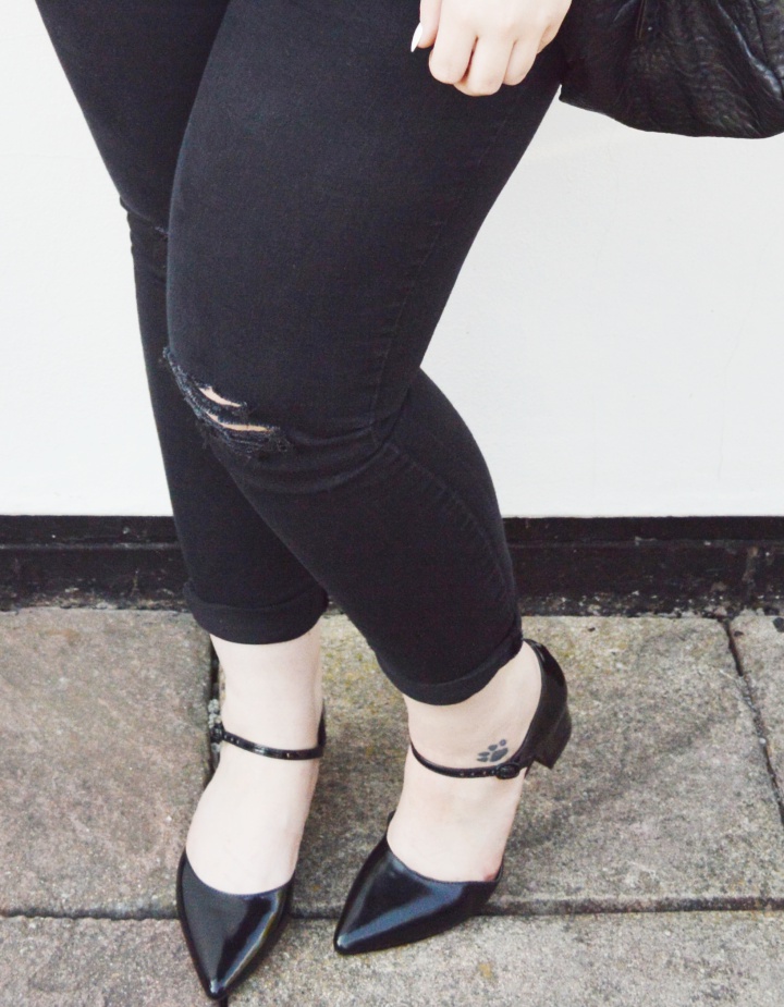 This season ripped jean's are definitely getting popular. I've never actually owned any ripped jeans well, apart from when I was going through my tom-boy stage. (let's not go into that) I'm currently questioning whether to get a pair of white jeans (ah scary!) Tomorrow I'm off shopping so I'll be trying on a pair in Primark just for the trial of course! Anyway, Last week I was feeling very confident and decided to put my five years of textiles qualifications into use and did some DIY on some very un loved jeans. Not too sure why I never wear black jean's I wear black all the time but never black jeans! I decided to rip them up and give them an added edge by applying light rips to the knee's.